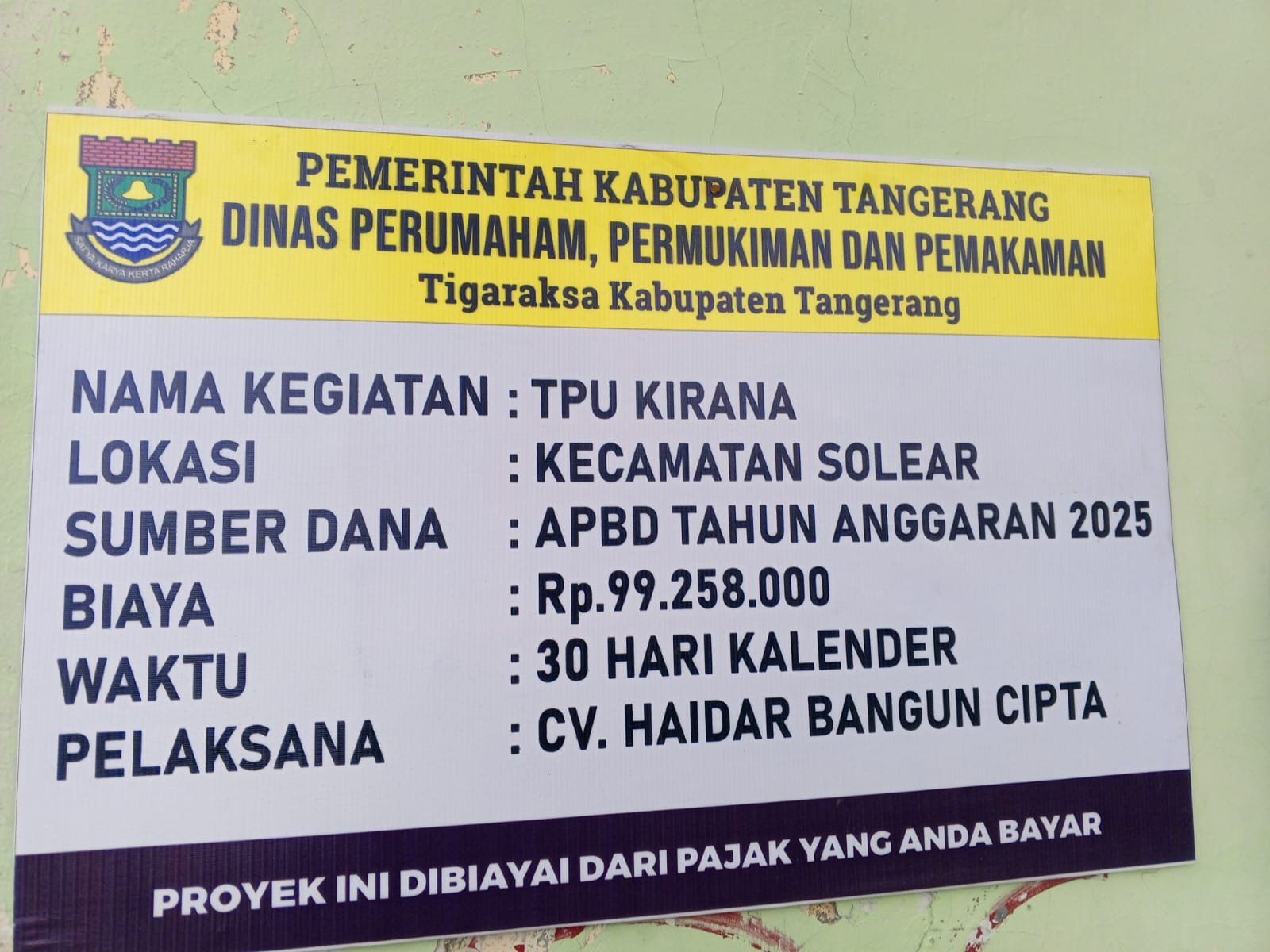 Selain judul proyek dianggap samar atau sengaja di samarkan Nama Kegiatan nya” Judul pelaksanaan proyek tersebut antara pemagaran dan renovasi kantor pemakaman daerah Tempat Pemakaman Umum (TPU) yang terletak di Ds.Pasanggrahan Kec.Solear, namun hanya di tulis pada papan proyek adalah “Nama Kegiatan : TPU KIRANA, Hal itu menimbulkan pertanyaan bagi para penggiat sosial kontrol.