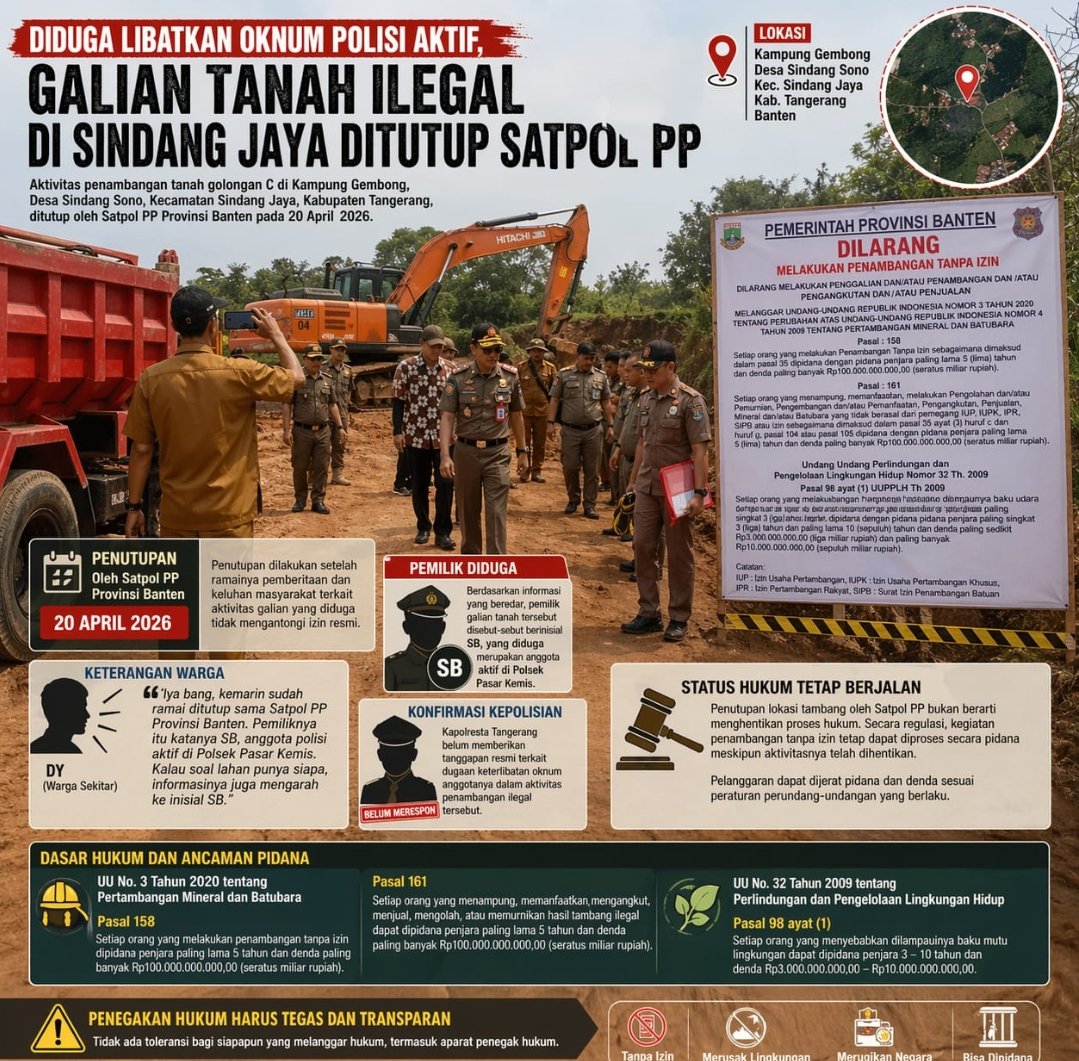 tintaindependen.com, TANGERANG – Kegiatan penambangan tanah golongan C yang menjadi sorotan publik di Kampung Gembong, Desa Sindang Sono, Kecamatan Sindang Jaya, Kabupaten Tangerang, akhirnya ditutup oleh Satuan Polisi Pamong Praja (Satpol PP) Provinsi Banten pada 20 April 2026.