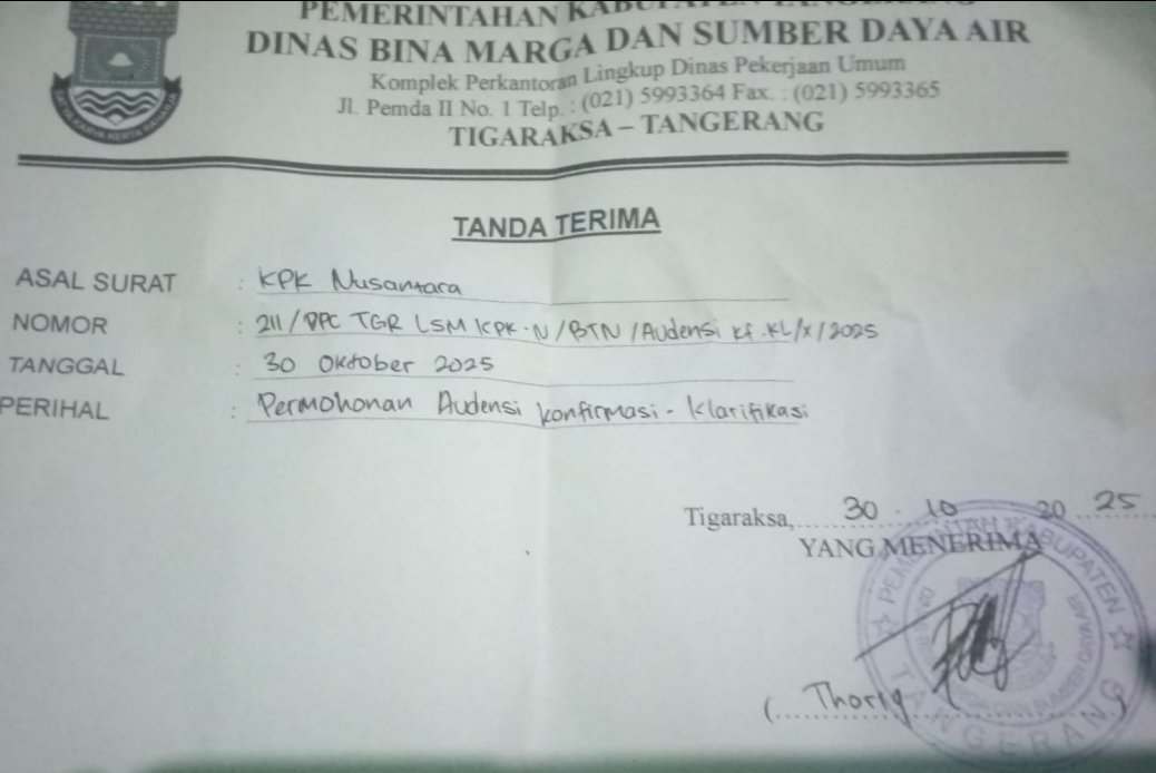 tintaindependen.com Tangerang, – Lembaga Swadaya Masyarakat (LSM) Komunitas Pemantau Korupsi (KPK) Nusantara Dewan Pimpinan Cabang (DPC) kabupaten Tangerang melayangkan surat audiensi kepada Dinas Bina Marga dan Sumber Daya Air(DBMSDA) kabupaten Tangerang untuk meminta klarifikasi atas beberapa temuan yang diduga fiktif atau tidak di realisasikan, Kamis (30/10/2025).