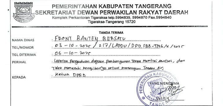 Ketua FBB Kabupaten Tangerang, Asep Supriyatna, menyampaikan bahwa laporan resmi telah dikirim pada Senin, 6 Oktober 2025, ke Kementerian Lingkungan Hidup dan Kehutanan (KLHK) RI cq Ditjen Gakkum KLHK, Ketua Komisi XII DPR RI, Gubernur Banten, Polda Banten, dan Dinas Lingkungan Hidup Provinsi Banten, dengan tembusan kepada Bupati Tangerang dan DPRD Kabupaten Tangerang.